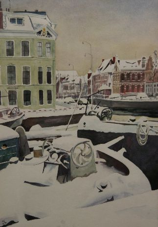 De kleuren zijn niet fel aangebracht op het werk, maar door de sneeuw en de donkere kades en schepen is er groot contrast ontstaan.